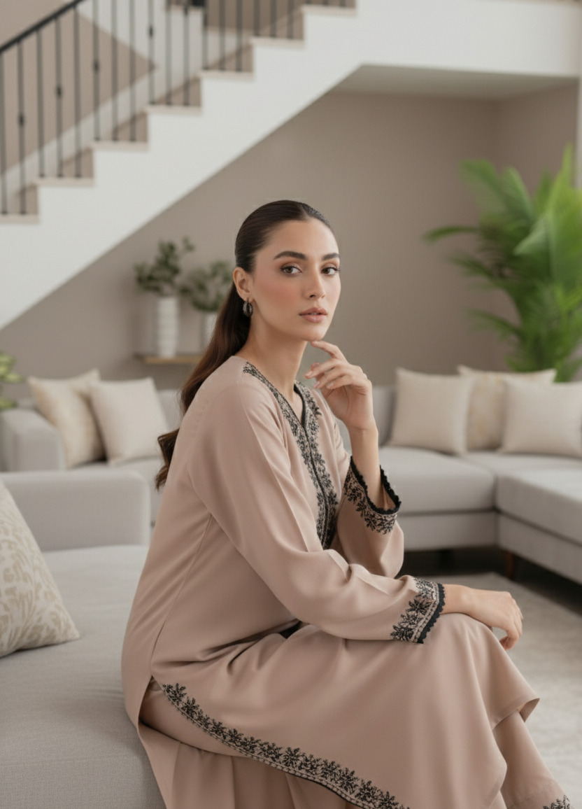 Pakistani Style Cappuccino Beige 2-Piece Women’s Suit with Black Embroidery