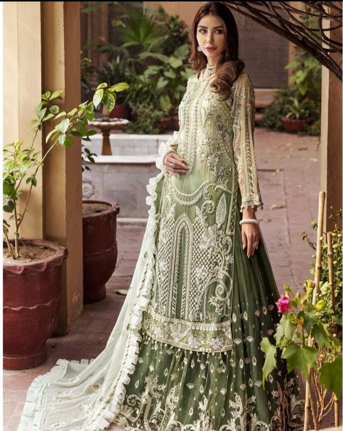 Indian & Pakistani Olive Green and Ivory Embroidered Net Formal Dress with Dupatta and Sharara