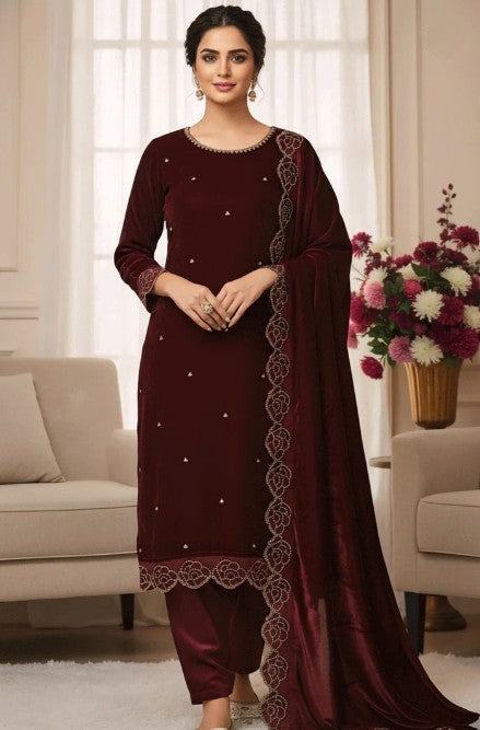 Indian & Pakistani Style Deep Maroon Embroidered Velvet 3-Piece Formal Suit for Women