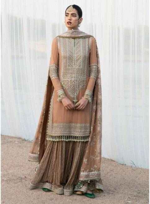 Indian & Pakistani Style Nude Beige Embroidered Net Formal Ensemble with Sharara and Dupatta for Women