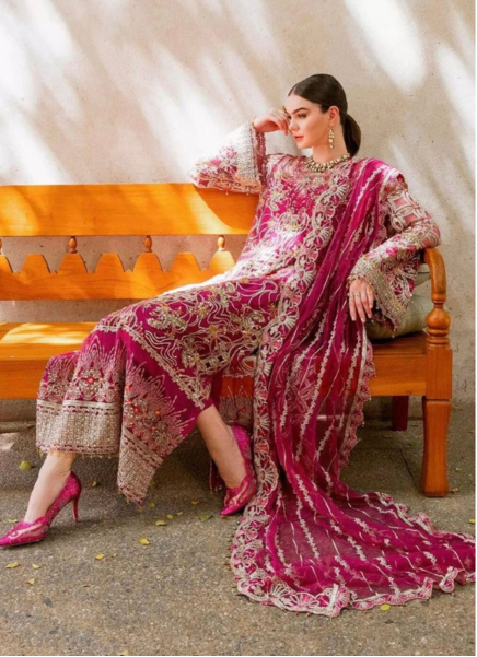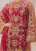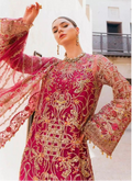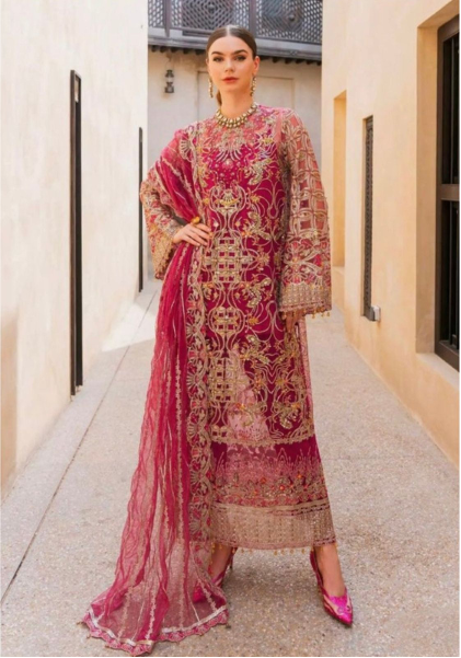 Pakistani Indian Style Women’s Magenta Gold Embroidered Net Formal Ensemble