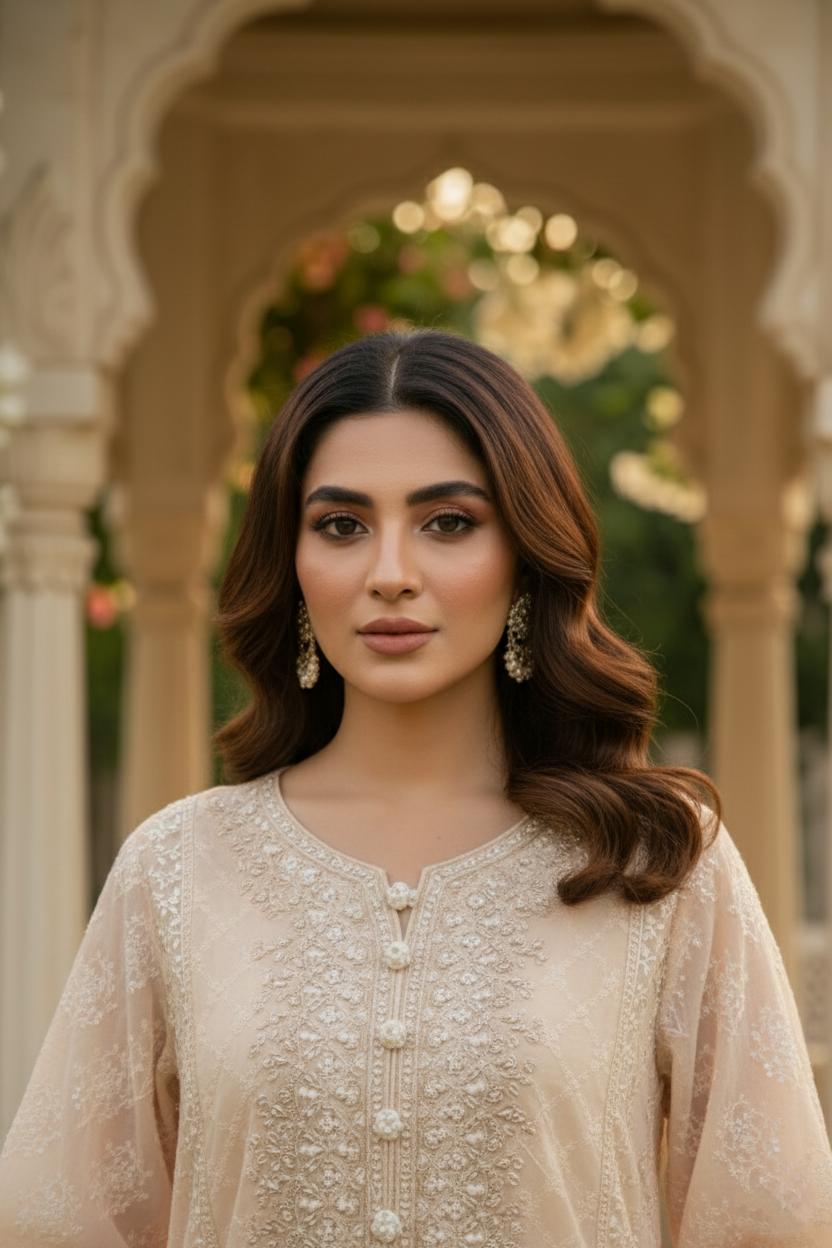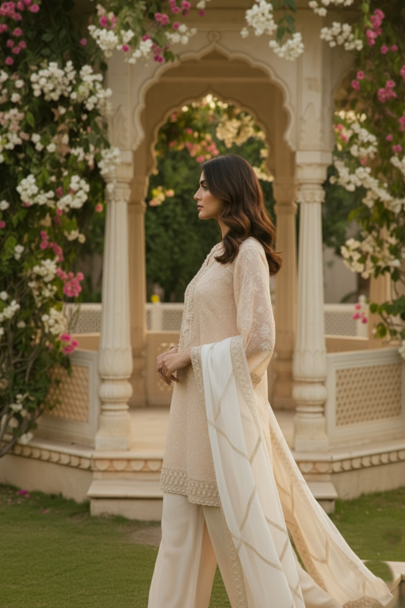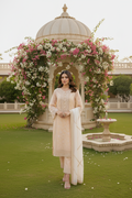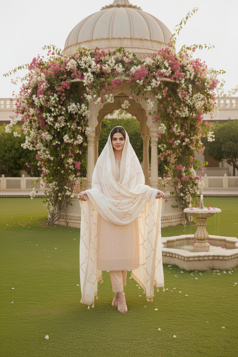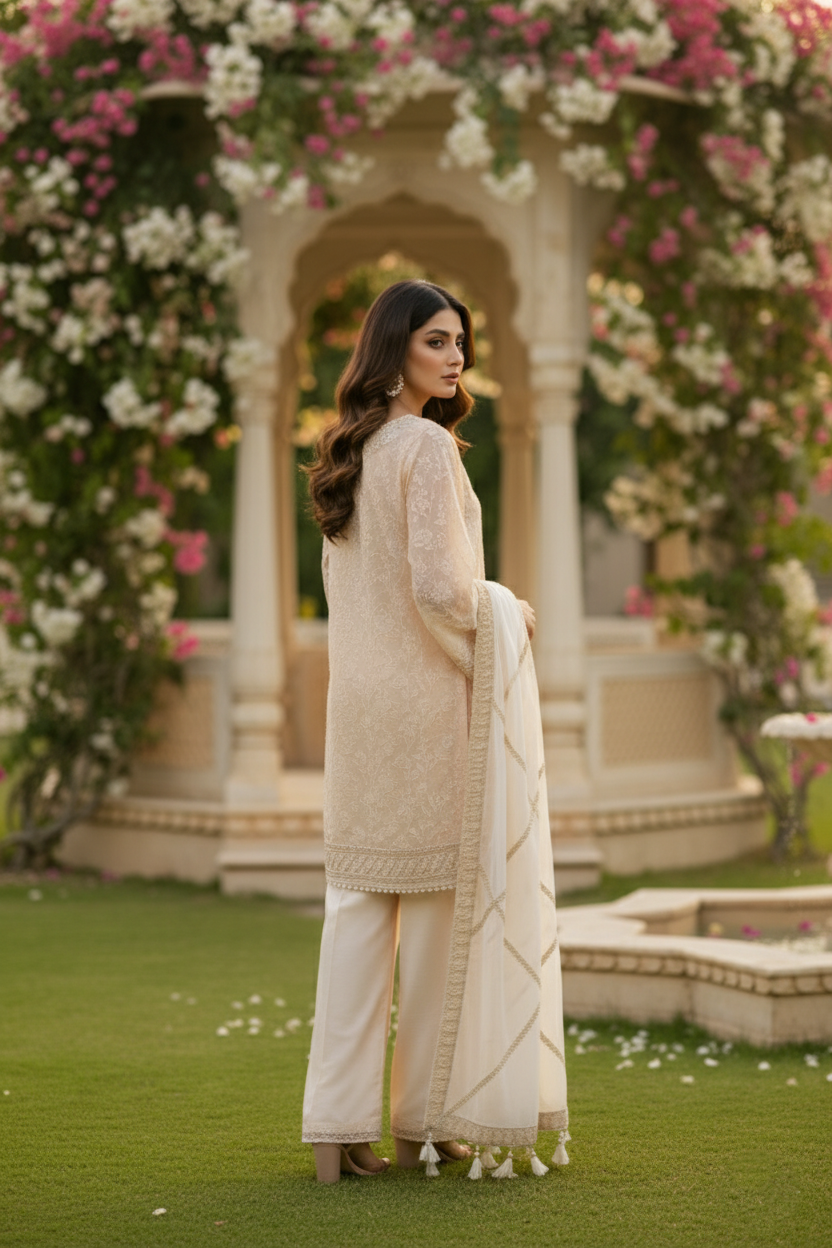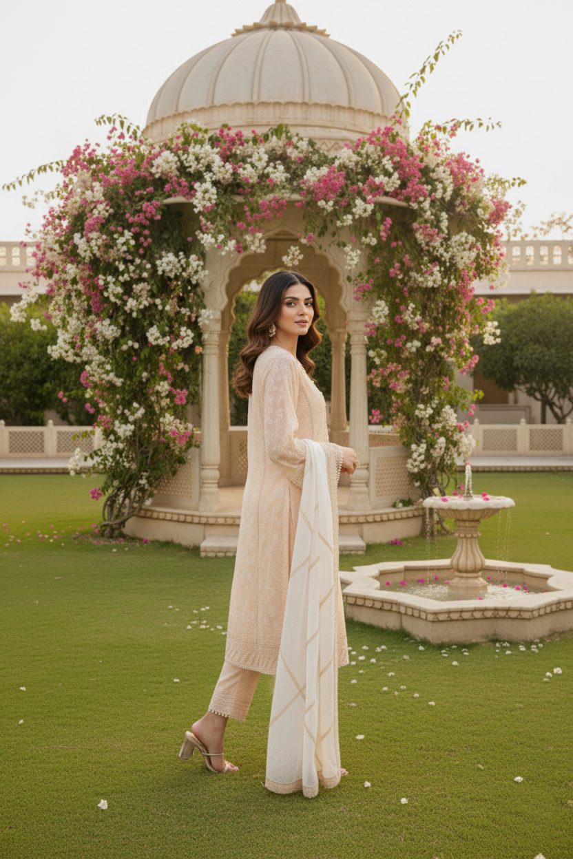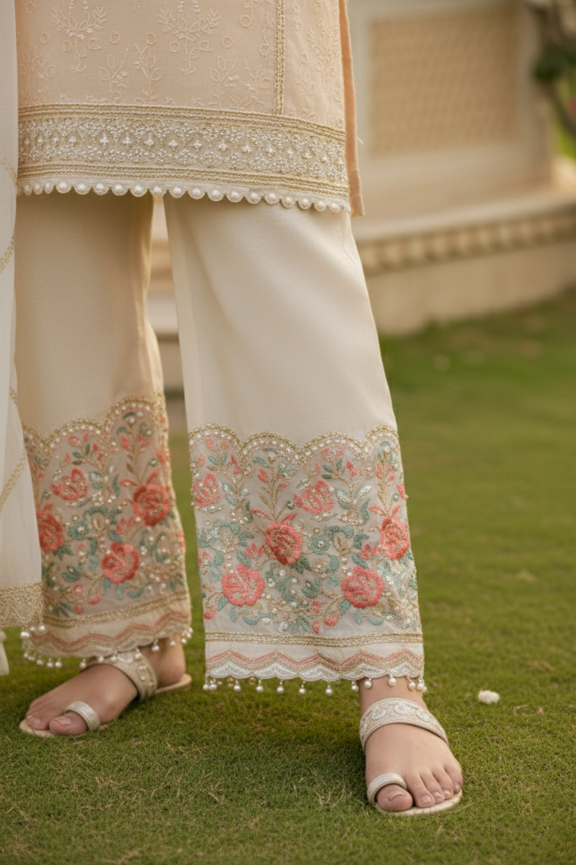 Embrace understated elegance with this cream-peach cotton net ensemble, delicately embroidered with graceful floral scrollwork along the neckline and sleeves. Soft pearl accents and refined trims add a subtle hint of luxury. The matching shalwar is detailed with intricate embroidered borders, creating a perfectly balanced silhouette. Completing the set, a kulla karandi dupatta—highlighted with embroidered diagonal lines and playful tassels—brings a festive finish. This three-piece outfit is an ideal choice for intimate Eid lunches, family gatherings, and chic day celebrations.