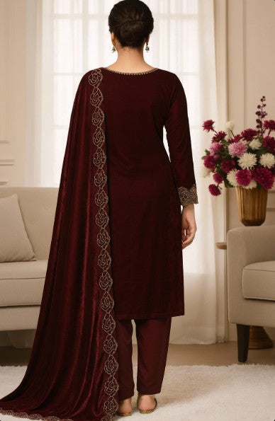 Indian & Pakistani Style Deep Maroon Embroidered Velvet 3-Piece Formal Suit for Women