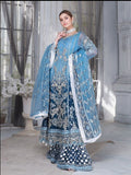 Indian & Pakistani Style Elegant Sky Blue & Navy Embroidered Net Formal Ensemble with Sharara and Dupatta