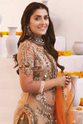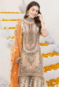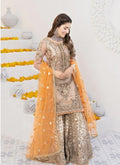 Experience Radiant Grandeur with this Soft Gold formal Ensemble, meticulously adorned with delicate hand Embroidery and Shimmering Embellishments. The gracefully tailored Shirt showcases intricate Zari, Sequins, and Resham work that exudes a luxurious sheen, while the Glistening Sharara enhances its Regal Silhouette. A contrasting Orange Dupatta, embellished with floral Motifs and Gold Embroidery, lends a festive touch of warmth and charm. Perfect for weddings, festive soirées, and engagement celebrations, this ensemble captures the essence of timeless tradition with a modern, luminous allure.