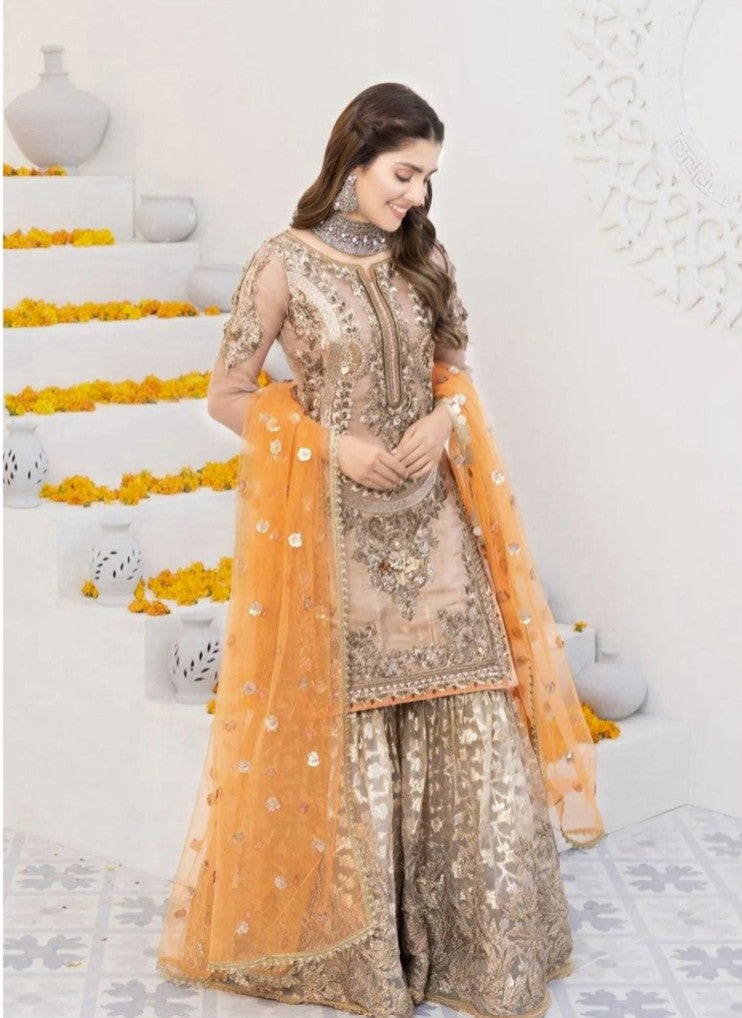 Indian & Pakistani Style Nude Beige Embroidered Net Formal Ensemble with Sharara and Dupatta for Women