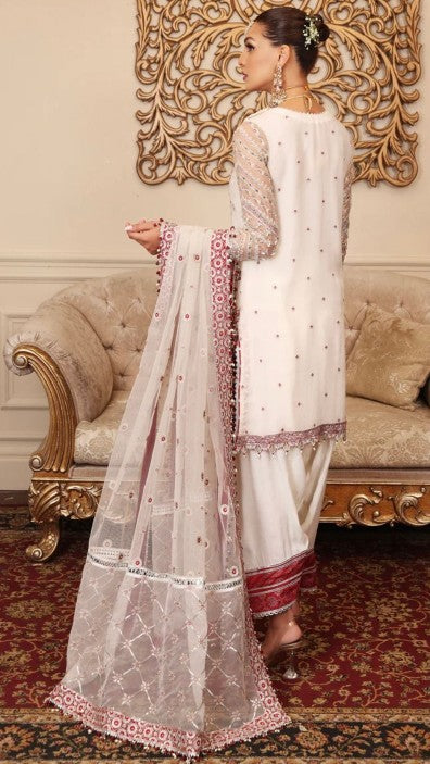 Elevate your festive wardrobe with this stunning White and Red formal ensemble, a timeless symbol of grace and elegance. The intricately embroidered Net Shirt is beautifully adorned with Silver Zari, Sequins, and Crystal detailing, creating a perfect balance of Shimmer and sophistication. The Red Embroidered Borders and Neckline add a bold touch of tradition, while the matching Dupatta enhances the overall allure with delicate embellishments. This refined outfit is ideal for festive gatherings, engagement events, or formal evening celebrations.