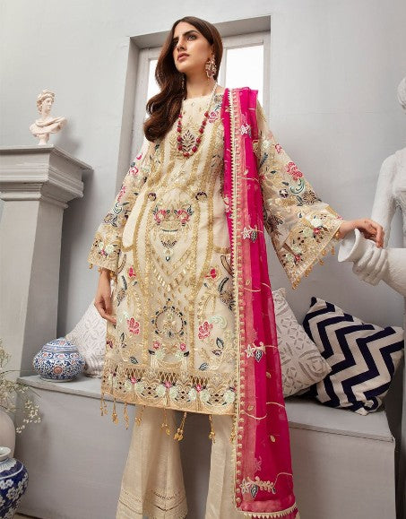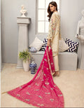 Indian & Pakistani Style Ivory Embroidered Chiffon Ensemble with Hot Pink Dupatta and Trousers