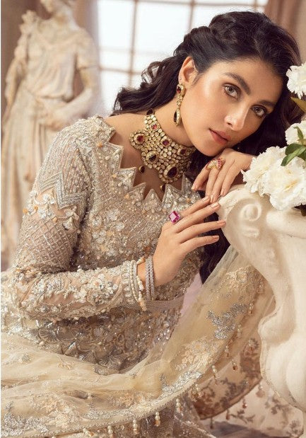 Embrace ethereal elegance in this breathtaking Ivory Bridal ensemble, masterfully designed to radiate sophistication and grace. The floor-length Gown features intricate Hand Embroidery with Silver Zari, Dabka, Sequins, and Resham Detailing that Glimmers softly under the light. A delicately embroidered Dupatta with Scalloped Borders and Floral Motifs adds a dreamy, romantic touch to the overall look. This timeless piece captures the perfect harmony between traditional craftsmanship and modern bridal Allure, making it ideal for Nikkah, Wallima, or Reception events.