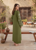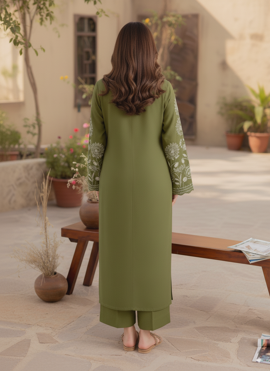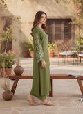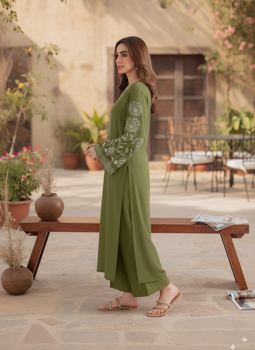 Step into timeless elegance with this beautifully crafted olive green 2-piece outfit. Designed with a straight-fit silhouette, it features delicate white embroidery on the neckline and sleeves, adding a graceful touch of tradition to modern wear. The soft fabric ensures comfort, while the modest design makes it perfect for casual gatherings, festive occasions, or semi-formal wear.