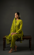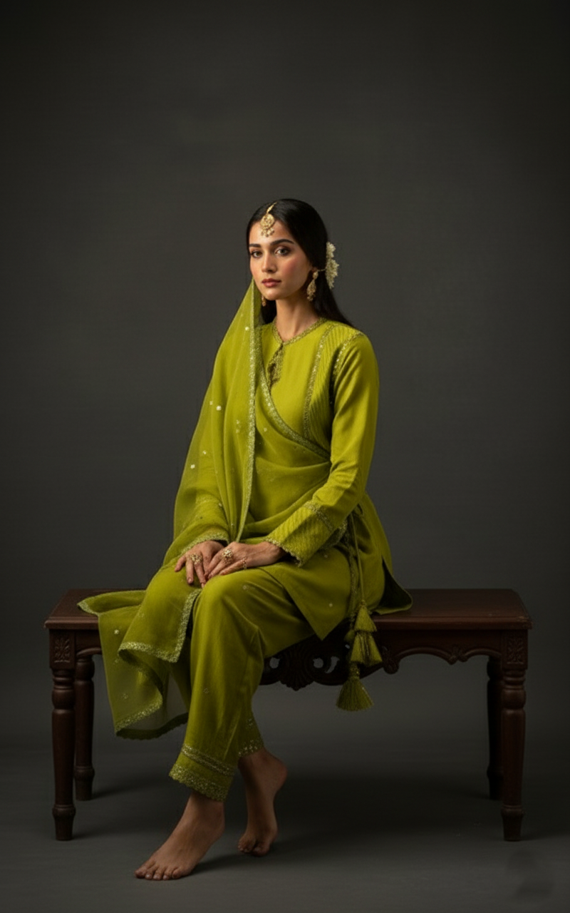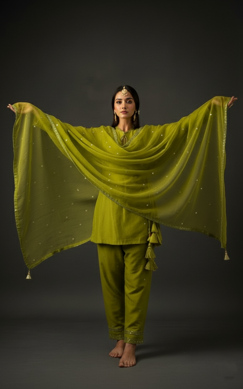 Step into timeless elegance with this exquisite olive green suit set, expertly designed to blend tradition and sophistication. Crafted from premium fabric, the ensemble includes a straight-cut kurta, matching pants, and a beautifully adorned dupatta, making it perfect for festive occasions, weddings, and cultural gatherings.