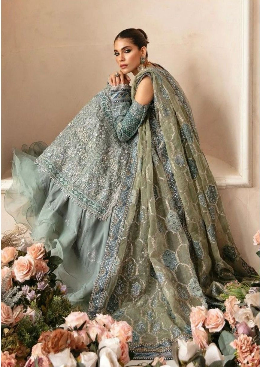 Grace meets grandeur in Sahar, a breathtaking ice blue ensemble that captures the beauty of tradition with a modern silhouette. This stunning floor-length Gown is meticulously hand-embellished with Sequins, Pearls, Zari, and Crystal detailing, creating an ethereal shimmer. The elegant Net Dupatta features intricate geometric Embroidery and Scalloped borders, enhancing its regal charm. Perfect for weddings, engagements, or festive evenings, this dress embodies refined sophistication and timeless artistry.