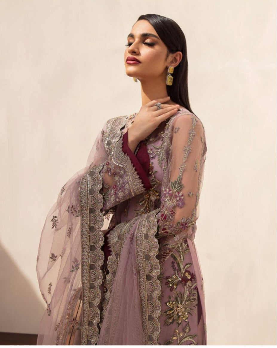 Grace meets grandeur in this enchanting dusty mauve outfit, crafted with exquisite artistry and intricate embellishments. The long Net Shirt features Ornate Gold and Maroon Embroidery, delicately handworked with Sequins, Tilla, and Resham Threads. The detailed hemline and Sleeves add a touch of regal charm, while the rich Dupatta with Embroidered Borders completes the look beautifully. Ideal for festive gatherings, weddings, or elegant soirées.