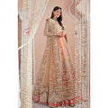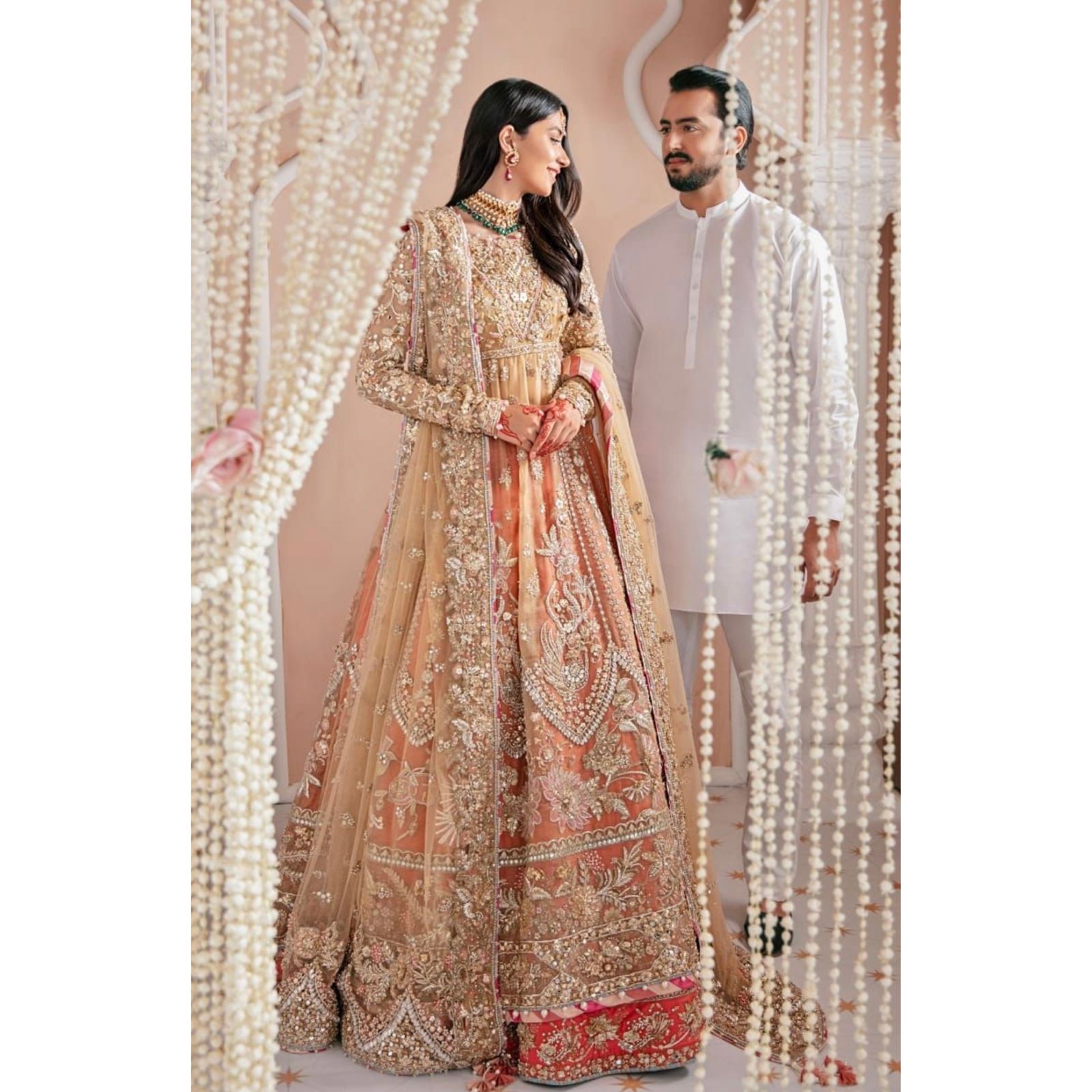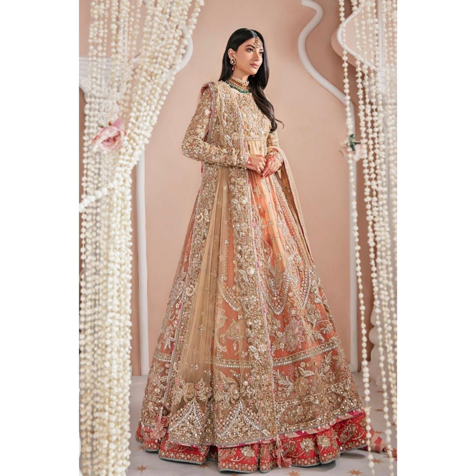 Peachy-orange base with heavy golden embroidery and embellishments, accented with red and silver details.