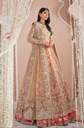 Radiate timeless elegance with an exquisite peach gold bridal creation crafted for the modern yet traditional bride. This majestic ensemble showcases intricate Zari, Resham, and crystal Embroidery that cascades gracefully over delicate Net fabric. The outfit features a fully embellished long Jacket paired with a voluminous Lehenga, adorned with scalloped borders and floral Motifs. A beautifully detailed Dupatta completes the look with its ornate handwork and regal drape. This is a true reflection of artistry, designed to make every bride feel ethereal on her special day.