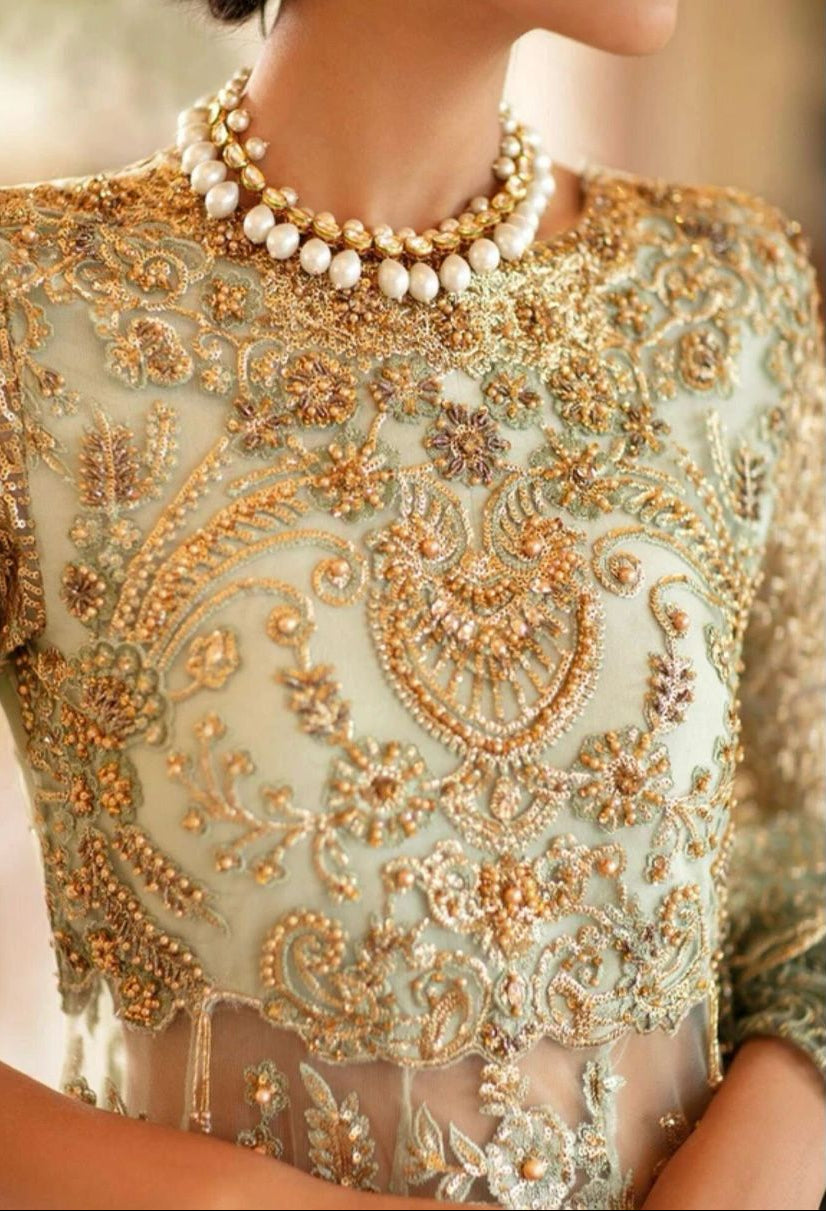 Indian & Pakistani Designer Pistachio Green Long Maxi Gown with Gold Zari & Resham Embroidery