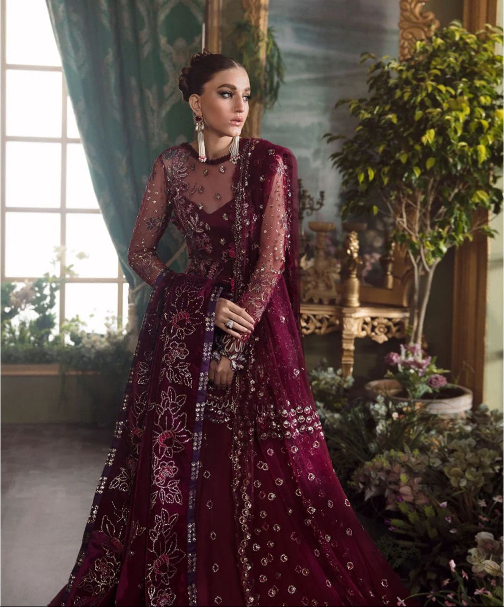 Pakistani Indian Style Maroon Embroidered Net Wedding Formal Ensemble for Women
