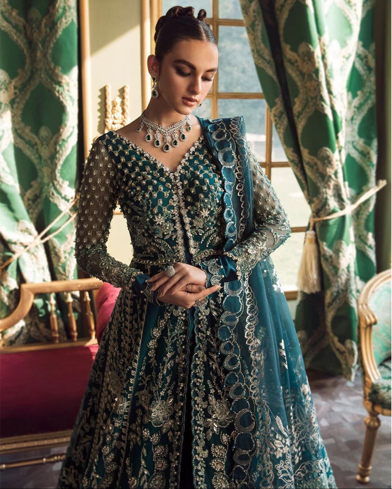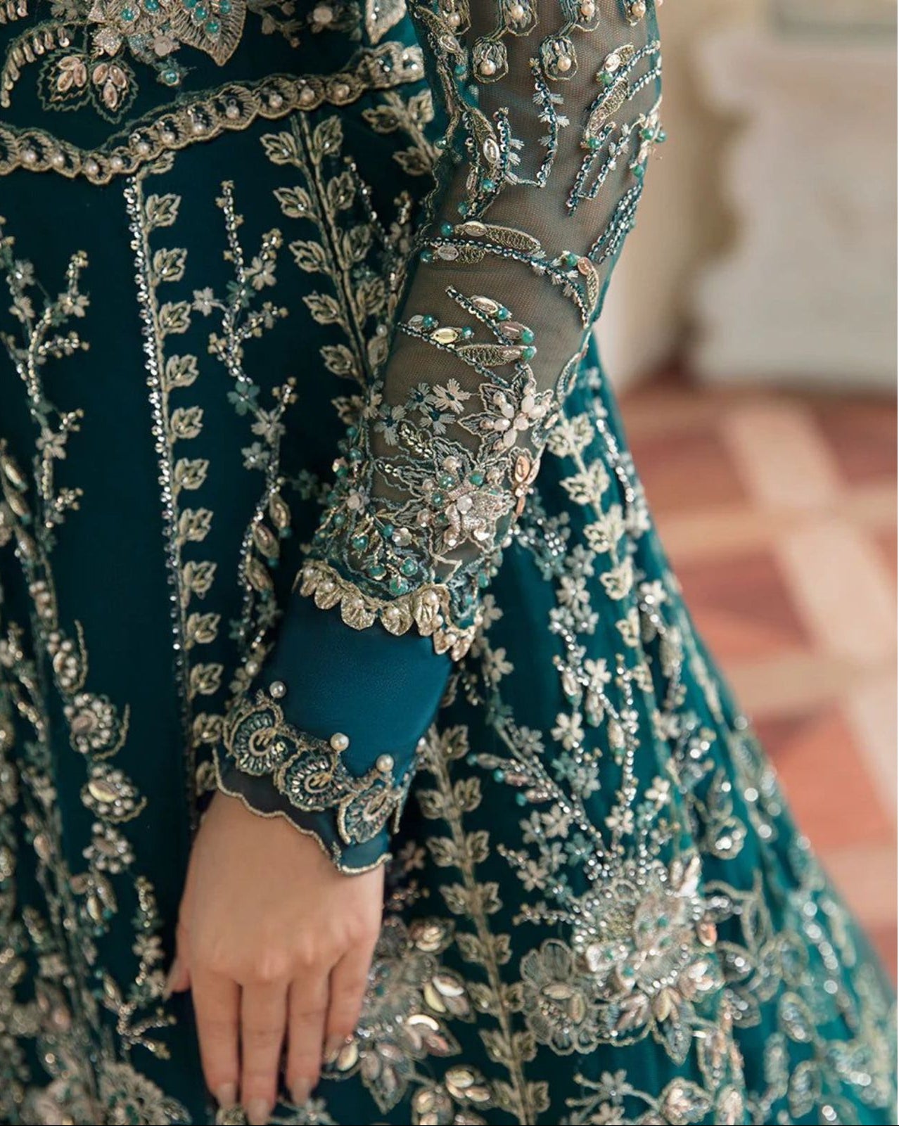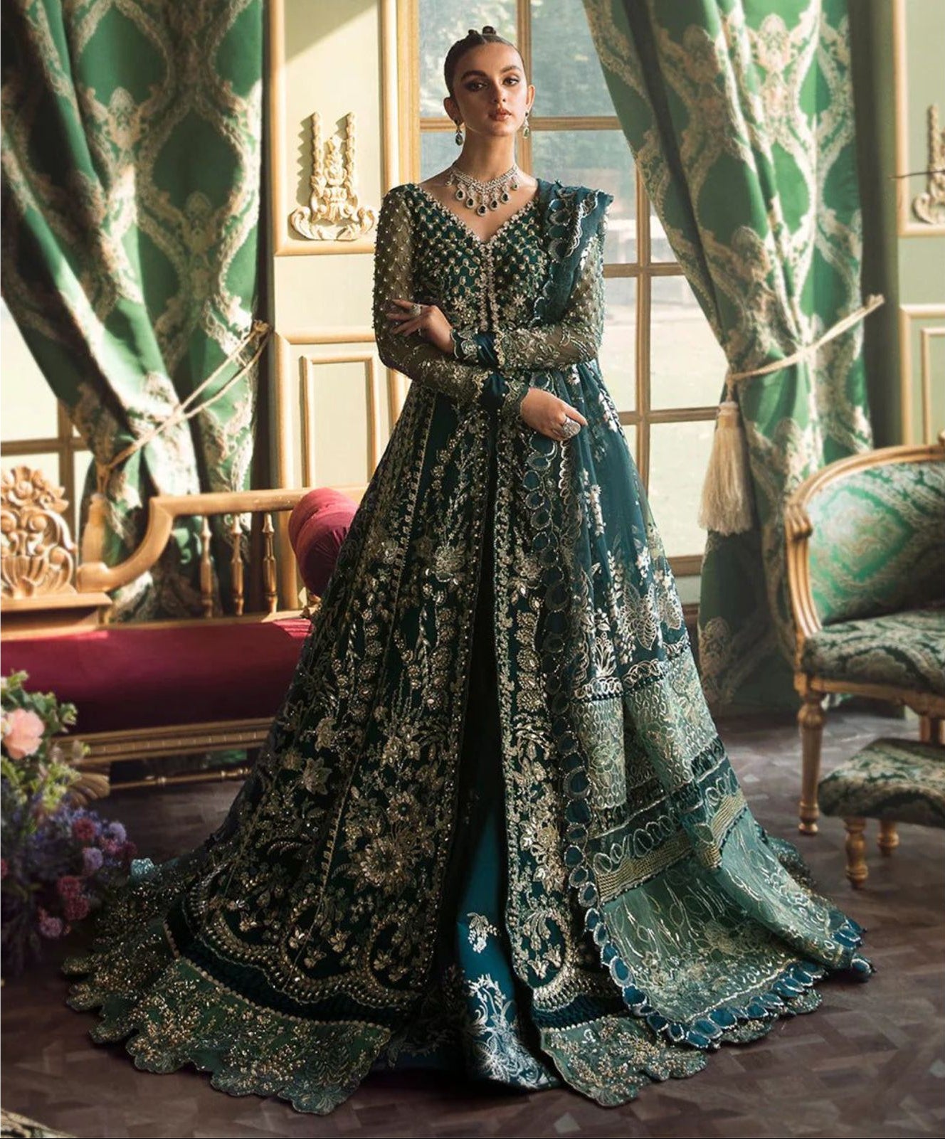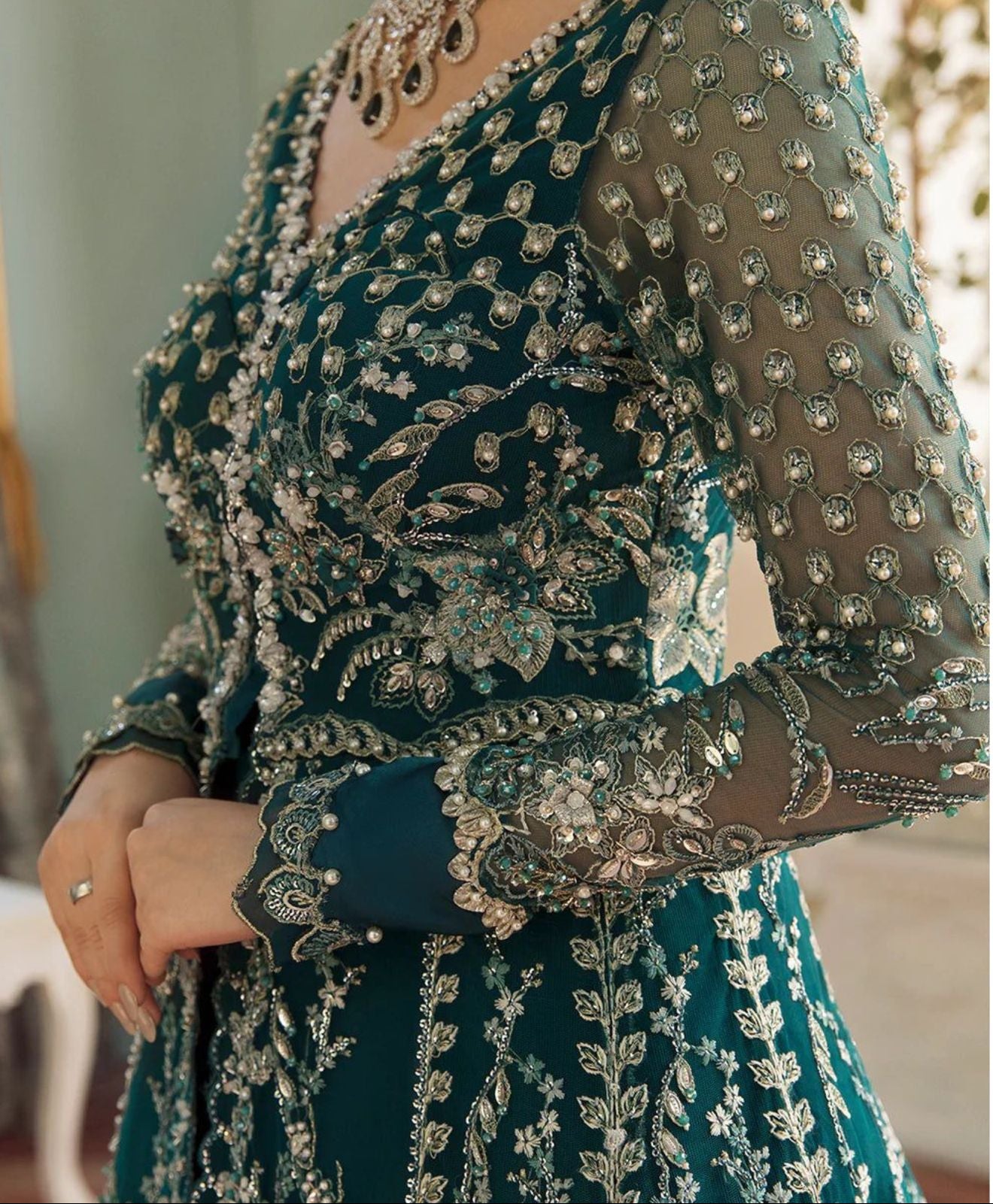 A lavish, designer-inspired bridal or premium formal gown in rich Emerald Green, adorned with intricate embellishments from head to hem. This luxurious Pishwas/Maxi-style ensemble seamlessly blends royal elegance with masterful artistry, making it an ideal choice for receptions, Nikah ceremonies, and upscale festive events.