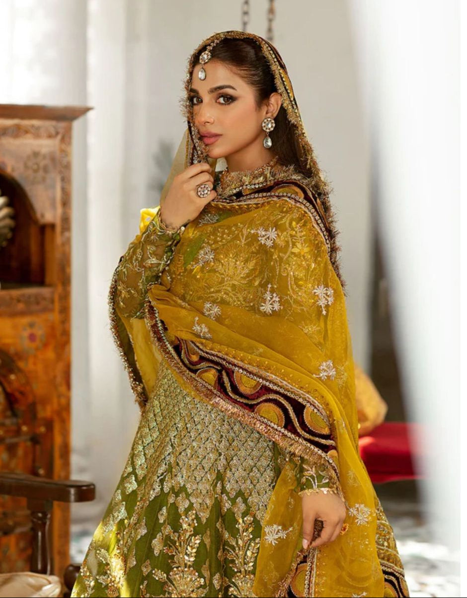 Embrace royal elegance with this majestic Olive Green and Mustard Gold ensemble that celebrates timeless South Asian craftsmanship. This breathtaking outfit showcases intricate Zari, Tilla, and Resham Embroidery, delicately adorned with Sequins and Beadwork. The Olive Green base exudes refined sophistication, while the Mustard Dupatta, enriched with heavily embroidered borders and Ornate Motifs, adds a regal finish. Perfect for weddings, receptions, or festive occasions, this look beautifully merges heritage artistry with contemporary allure.