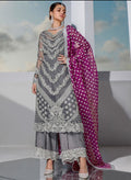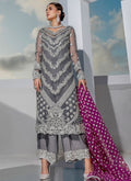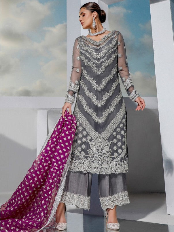 Luxury Grey Net Embroidered 3-Piece Suit with Silver Detailing & Contrast Dupatta